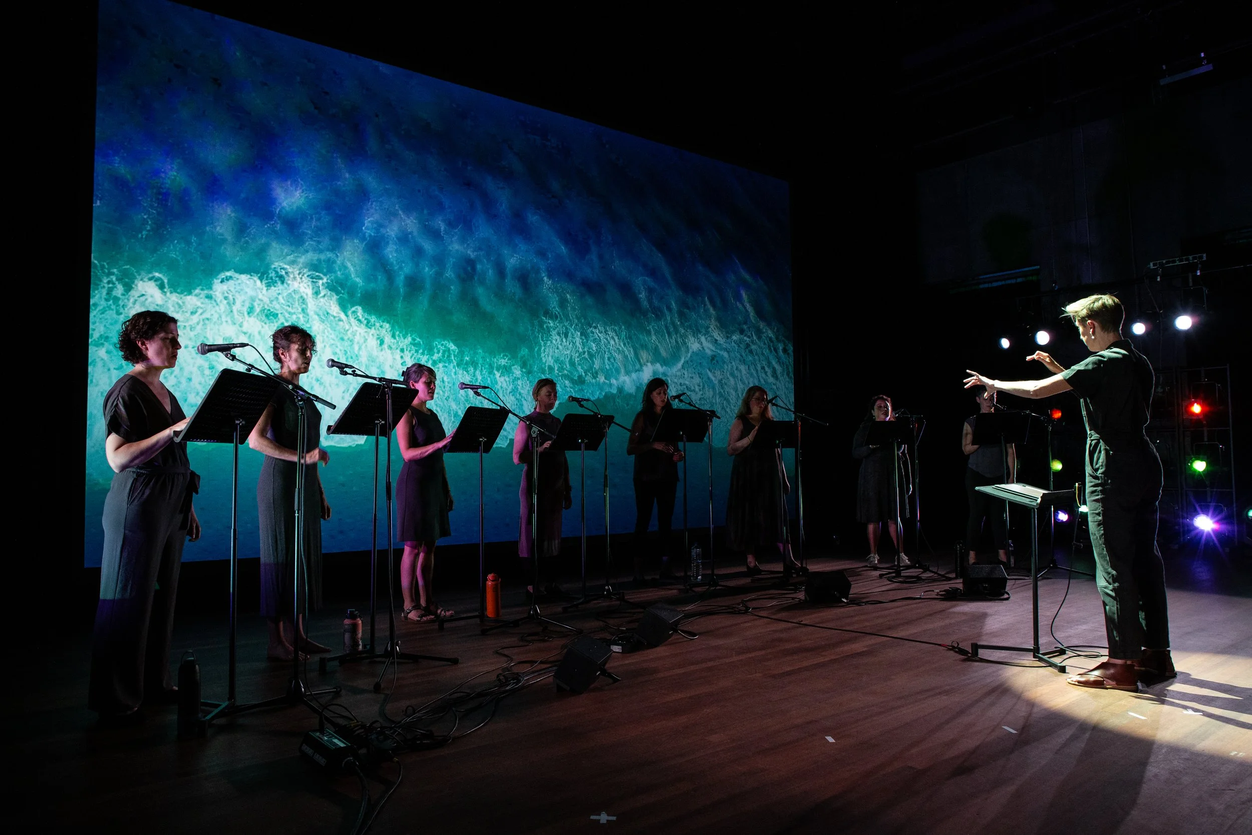 Lorelei Ensemble, with founder Beth Willer directing, in a performance of Christopher Cerrone’s Beaufort Scales. Melle Meivogel photograph